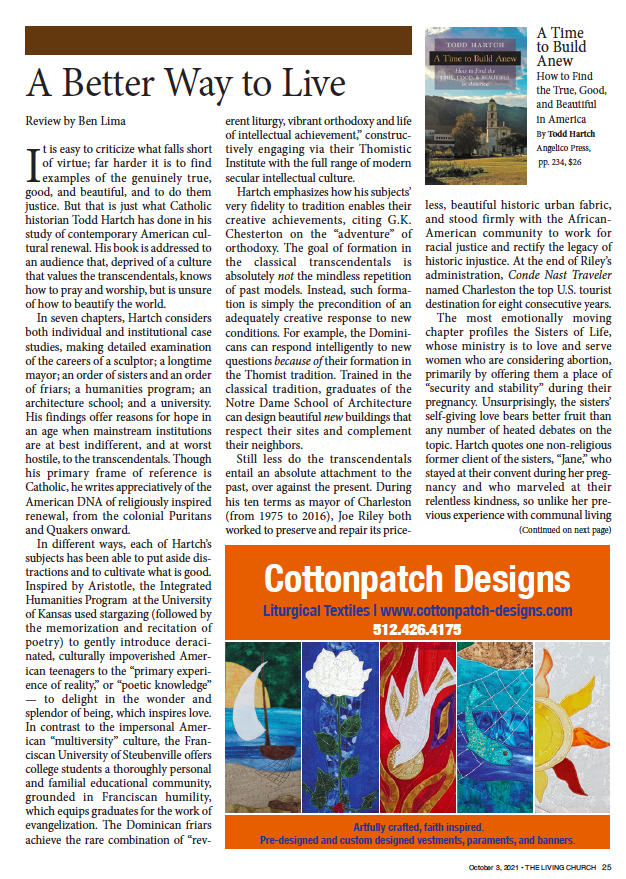 My review of the book by Todd Hartch, A Time to Build Anew: How to Find the True, Good, and Beautiful in America (Angelico Press) appeared in the October 3, 2021 issue of The Living Church.